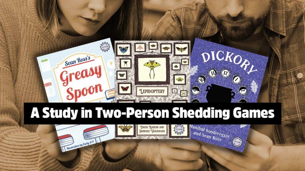 Fortunately, publishers like New Mill Industries exist, which specialize in small print run productions of niche card games. These are the laboratories of game design, giving mad scientists space to try new and unusual things. While New Mill specializes in trick-taking games specifically, publishing your trick-taking friend’s trick-taking friend’s favorite games, they’ve recently turned their attention to climbing games with the publication of Greasy Spoon, Dickory, and Lepidoptery, all of which are for two players.