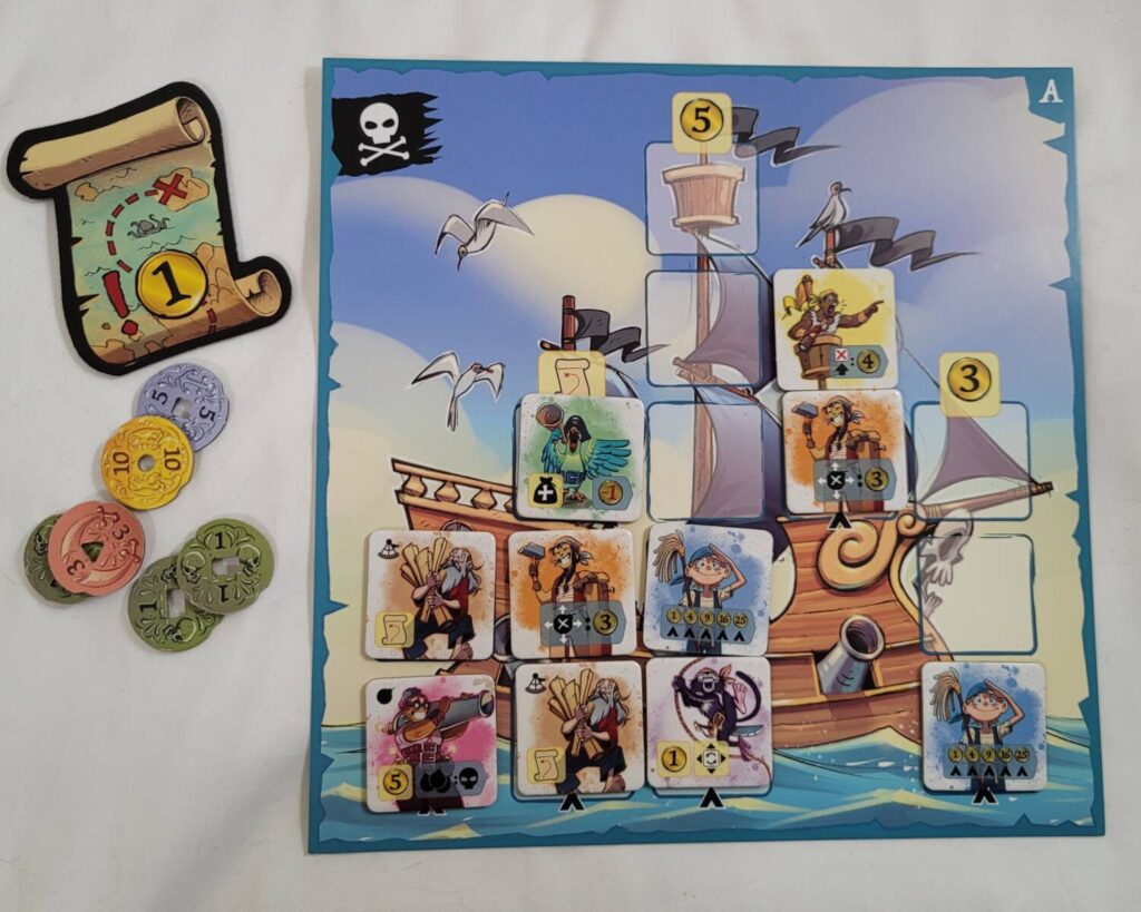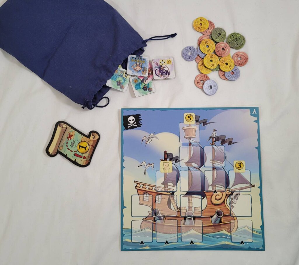 Even the setup is simple. Everyone agrees on which board they’ll be using (there are a total of four distinct boards) and each player takes one, ensuring that at least one player takes the board with the pirate flag on it that indicates the starting player. Create a pile of coins where everyone can reach them. Then, the tiles get tossed into the bag and mixed up. And, with that, you’re ready to begin.