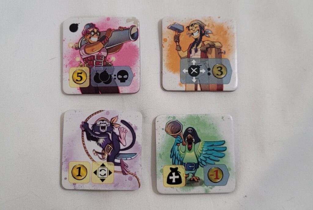 Captain Flip isn’t all press-your-luck, though. There’s a healthy dose of memory game sitting just beneath the surface. Consider the previous example of the Gunners. If you can recall what was on the flip side of the existing Gunners, maybe you can use a Monkey—who immediately rewards you with a coin and the option to flip an orthogonally adjacent tile when it appears—to flip one of them over later to something more useful, like a Parrot who, even though it’s worth -1 points at the end of the game, lets you immediately draw a new tile from the bag and play it. In that case, maybe flipping your Carpenter to a Gunner and gathering those five coins could be worth the risk.