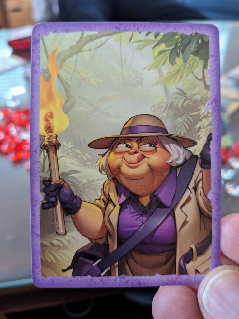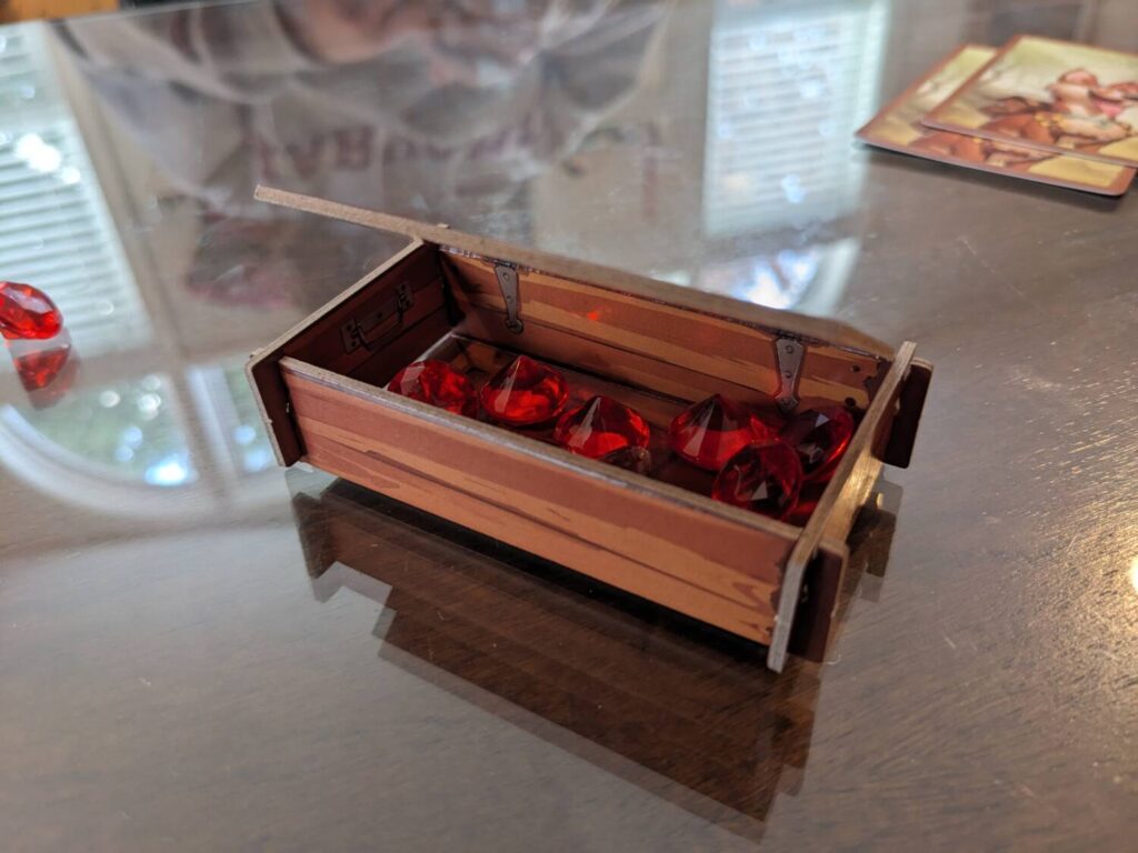 After five rounds, the player with the most gems secured by leaving the jungle wins. This 2024 version of the game has cute treasure chests to store player winnings, the white and red gems are chunky, and the artwork on the cards supplied by artist Paul Mafayon (both the expedition cards, as well as the cards players use to signal whether they are staying in the jungle or not) is perfect.