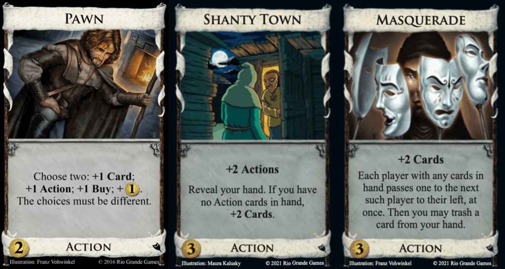 And whilst the theme does come through in the game play, the artwork in Intrigue is the most inconsistent in the entire game. Whilst all art is subjective, the mix of art styles make the visuals very jarring and Intrigue features some of the least well regarded art in the game. Not wishing to disparage the art of ‘Shanty Town’ but it’s possibly the most ill-fitting visual in the entire 500+ card ecosystem.