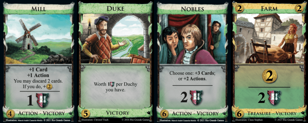 One of the criticisms of Dominion is that often your hand of cards plays itself. Intrigue’s cards let you decide how to use them. Choices are everywhere, from the 2 cost ‘Pawn’ with its 4 options to the 6-cost Victory/Action card ‘Nobles’ which provides you with either +3 Cards or +2 Actions. Speaking of ‘Nobles’, there are four new additional Victory cards, three of which are also Treasure or Actions, meaning they aren’t complete junk in your deck.