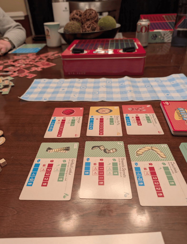 No matter your stage, you’re fighting with different boards to fit your recipes where you want them. Your preparation and resting areas are personal, so you’re only wrestling with your own recipes there. However, the central competitive regions of the board are the grill and the tablecloth. The grill features two distinct zones, one for meats and one for veggies. All players must place their recipes on the same grill, meaning there are advantages for you to put that unwieldy Hawaiian pizza in an inconvenient spot to box out others from having grilling space. Similarly, the tablecloth is where you’ll put your finished recipes to serve them. The tablecloth also has limited space, and importantly, placing a finished recipe on the tablecloth gives you bonus actions based on where you put it.
