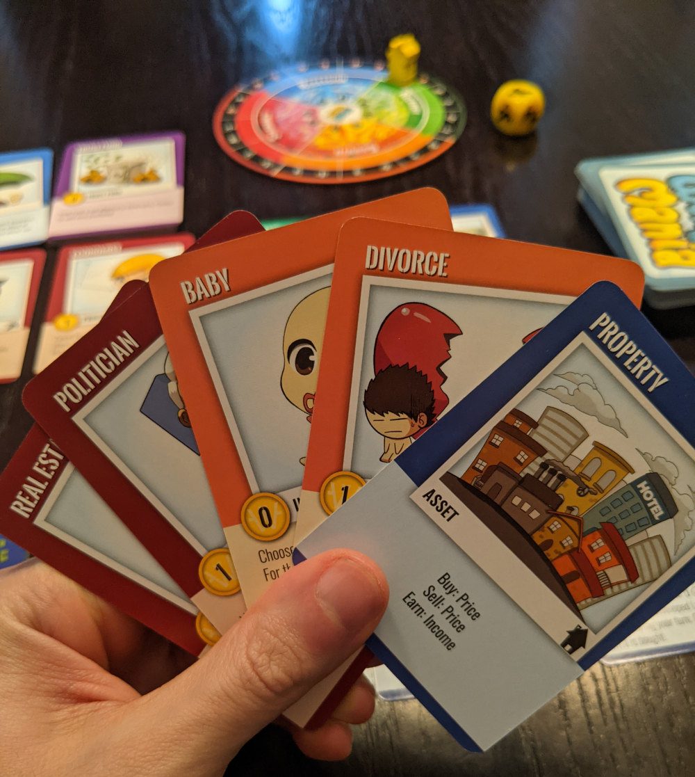 Trust Fund is the most important asset you can buy. Besides giving you a smack load of points, a bankruptcy cannot remove them. This isn’t Monopoly, so bankruptcy doesn’t eliminate you, but it will set you back. You do need to be careful because other players will use Incident and Global cards to mess with you. Incident cards target other players while Global cards disrupt the business cycle. Yes, this is a take-that game.