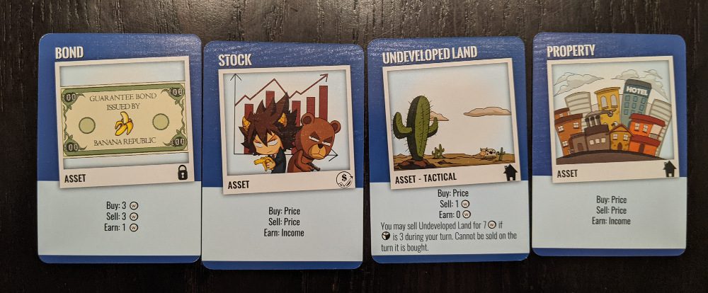Every game follows the same path. At the start, everyone will buy assets to build their portfolio if the business cycle is in favor, or play Global cards to manipulate the cycle. Once the assets are bought, the money will come in via income or sales during the positive cycles. After reaching at least 8 dollars, they will buy a Trust Fund. Do this three more times and the game ends.