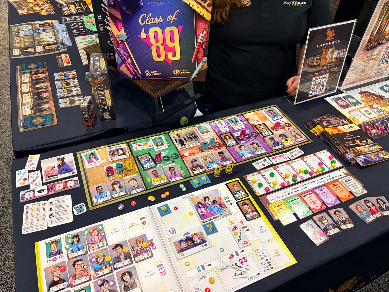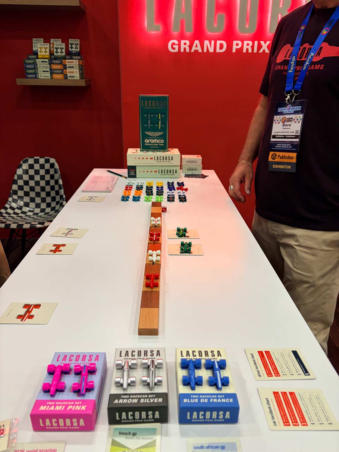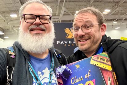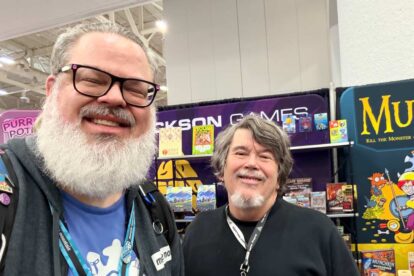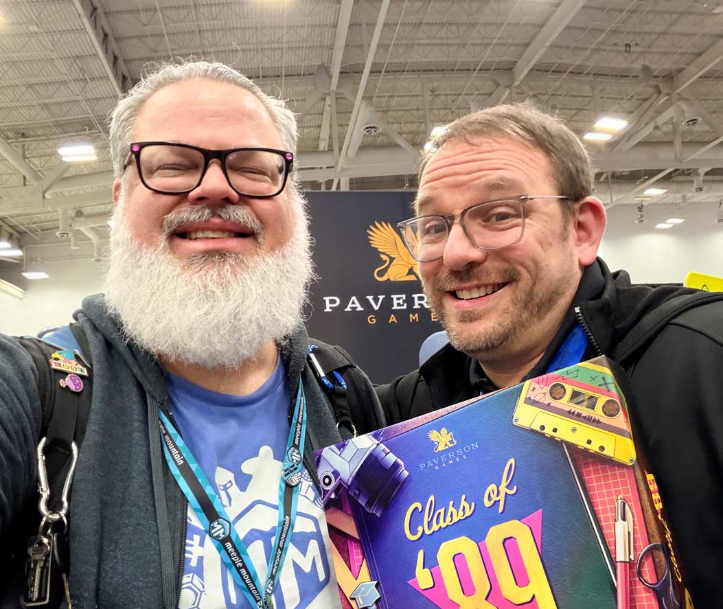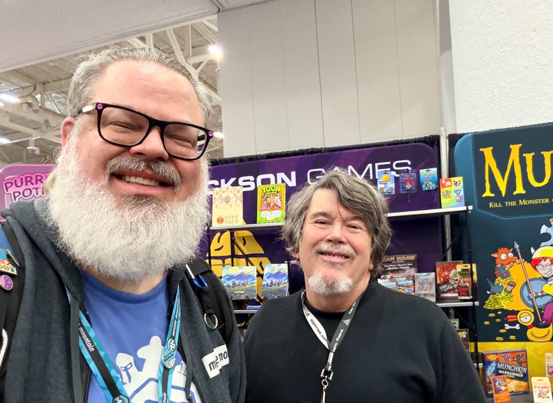 I reconnected with WizKids and got commitments to send lots of titles. Keymaster announced PARKS Europe, which looks great. Paverson Games showed off Class of ’89—a somewhat lighter game than Luthier or Distilled—that will be an insta-buy for me because that’s the year that I graduated high school! I stumbled across a really great looking old school racing game called Lacorsa. I got to meet Steve Jackson and took a picture just for my teammate K. David Ladage. I got to chat with Cole Wehrle and Kyle Ferrin from the newly formed Buried Giant Games, who told me that next year they have a “heist game” coming out. Exciting!