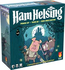 Ham Helsing is a cooperative adventure board game based on the graphic novel series about a reluctant monster-hunting pig. Join Ham, Ronin, Malcom, and Lobos as they attempt to save the world! Using a card-crafting system with transparent upgrade cards, protect locations from endless swarms of minions while powering up and improving your skills. Can you power up fast enough to stop the Villain from destroying Mud Canyon and save the day?