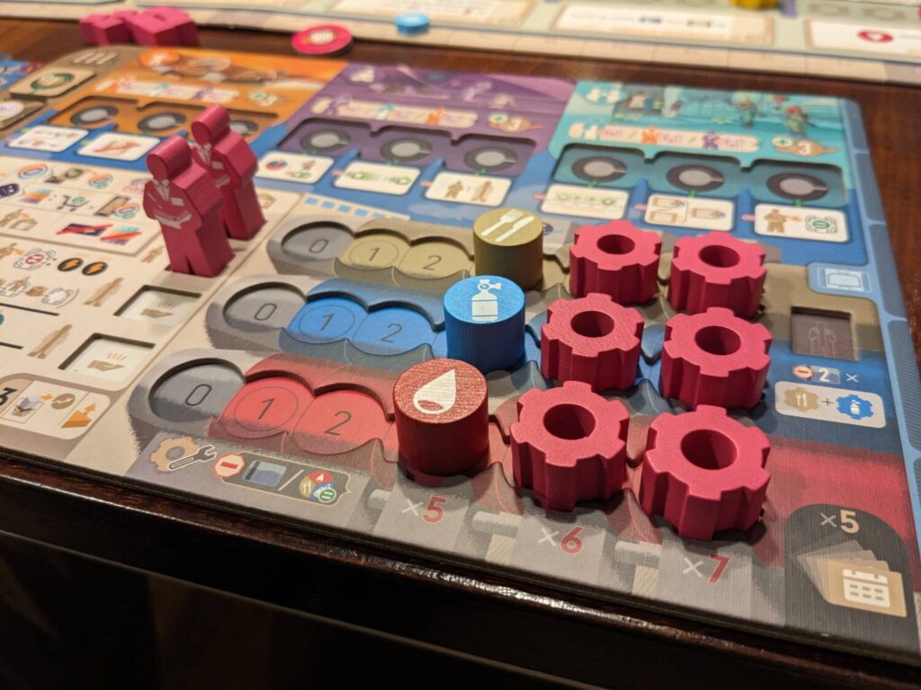 Where the experience elevates a bit is in the use of agenda cards, game-breaking abilities that can be played during a player’s turn as long as the card action aligns with the action being performed. (Cards double as one of the three main resources—food, oxygen, and fuel—if a player decides to burn the card for its resource instead.)