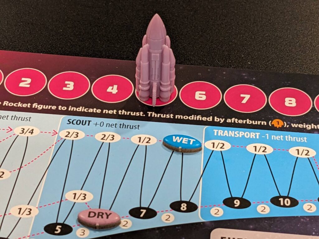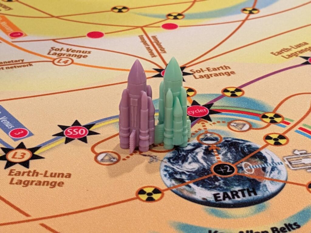 I was surprised how much this changed the game. That’s because the players who had nuclear rockets (with a net thrust of five and a cost of three wet mass per burn) were really watching to ensure they could get from place to place while also occasionally landing to take the ISRU (In-Situ Resource Utilization) Refuel action.
