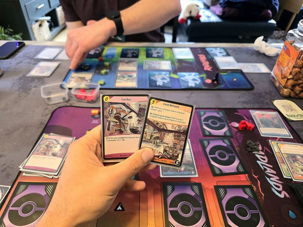 Fast forward a few years, and my gaming group caught the Netrunner bug. We started group orders for decks through the game’s subreddit and rotated duels during game nights. But, as with most systems, interest fizzled, and we moved on to other games. At PAX Unplugged in 2024, while wandering the hall with my buddy Jeff, we decided to check out Earthborne Games. We had just started playing Earthborne Rangers and were curious to see what was new. To our surprise, they mentioned a new card game rooted in Netrunner’s DNA. We jumped at the opportunity and hustled over to the demo table.