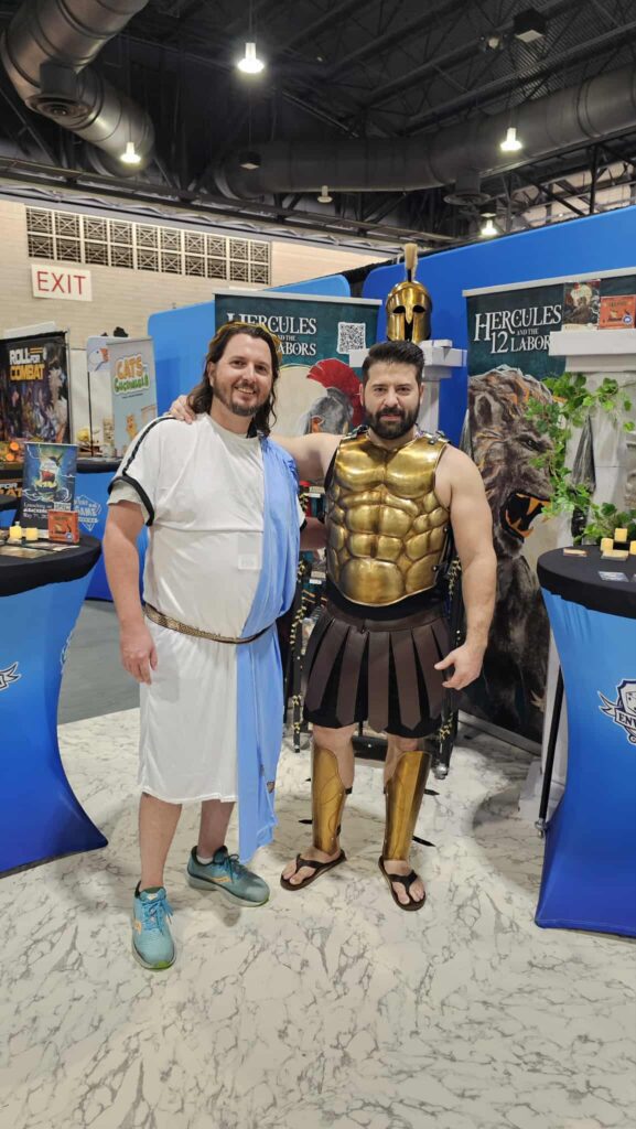 Last year, I stopped by Envy Born Games to buy a gift and was immediately charmed by their “fanny pack games” — an actual fanny pack filled with three games. If that’s not unique marketing, I don’t know what is. This year, the maverick energy continued for their latest release, Hercules and the 12 Labors, a solo adventure retelling the classic epics of the Greek demigod. No need to look at the cover art, the cosplay spoke for itself.