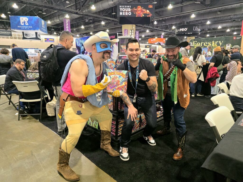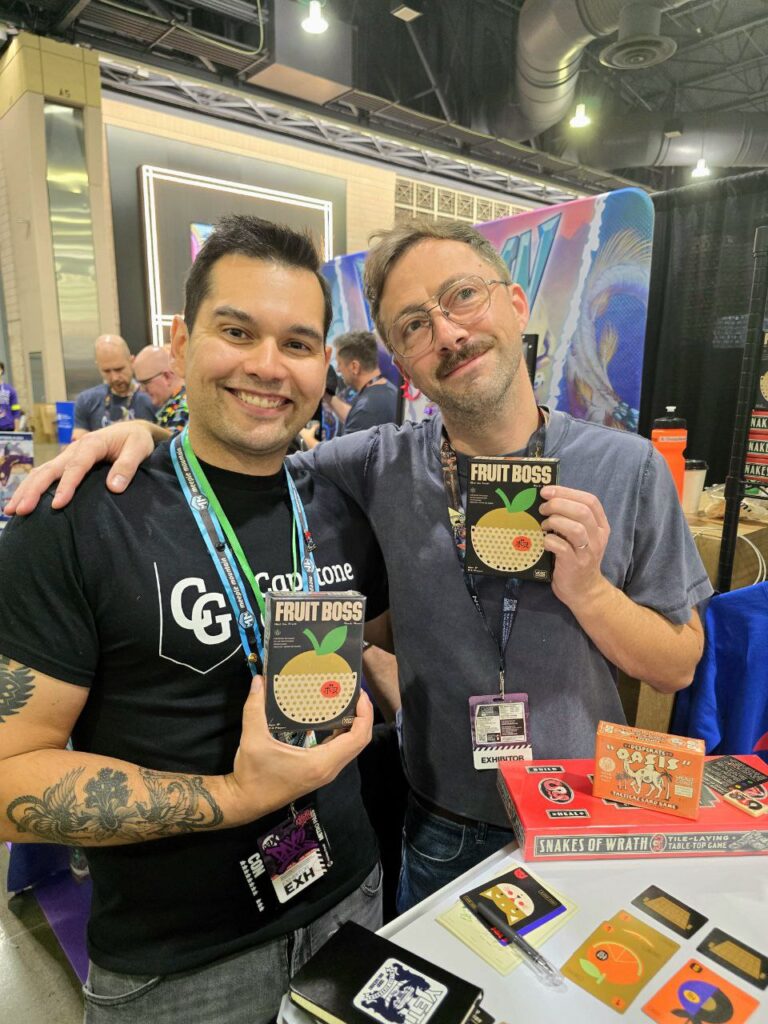 Capstone’s booth was front and center this year, placed right in front of the large queue of attendees eager to grab the hot games. Capstone premiered several titles, including a team-based trick-taking wrestling game called Rowdy Partners. The silly theme was promoted on Wednesday night with a media party featuring both designers in cosplay as their dynamic wrestling personas. Designers Jason Hager and Darren Reckner even taught the game in full costume at the booth, much to everyone’s delight.