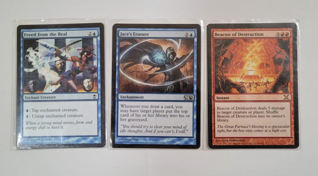 After we finished breakfast, we headed back over to Kevin’s place where we sat around talking about Magic, going through his mountain of cards, and reliving old memories. Like David, Kevin was happy to donate to the Commander deckbuilding effort, and I left his house with another 20 cards or so. Of particular note are these: Freed From the Real, Jace’s Erasure, and Beacon of Destruction.