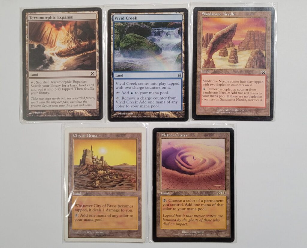 From my own personal supply, I was able to scrounge up another few non-basic lands that could work in my deck: Terramorphic Expanse, Vivid Creek, Sandstone Needle, City of Brass, and Meteor Crater. All have their weaknesses. Terramorphic Expanse lets you dig through your library to find a basic land of your choice, but that land comes in tapped, unusable until the next turn. Vivid Creek and Sandstone Needle enter play tapped, produce a decent chunk of mana once they’re untapped, but eventually disappear. City of Brass gives me exactly what I need at the cost of my own health. And, Meteor Crater requires me to have another colored permanent in play in order for it to be useful. Of those, I predict City of Brass will be the most useful in almost any given situation.