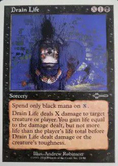 To better understand that, let’s consider this example: Drain Life. Drain Life is a black card with a casting cost of X1B. That is, one colorless mana, one black mana, and X which the card defines as “Spend only black mana on X. Drain Life deals X damage to any target. You gain life equal to the damage dealt, but not more life than the player’s life total before the damage was dealt, the planeswalker’s loyalty before the damage was dealt, or the creature’s toughness.” That last italicized bit is just a fancy way of saying, you can only drain something down to 0. You can’t make it go into the negatives. So, if the player sitting across from you only has five health, you can’t drain more than five life from them. To do so, you would ‘tap’ one swamp to pay for the B in the casting cost, an additional land to pay for the 1 in the casting cost, and five other lands to pay for the X. Then, the target would lose five life, and that amount of life would be added to your own life total.