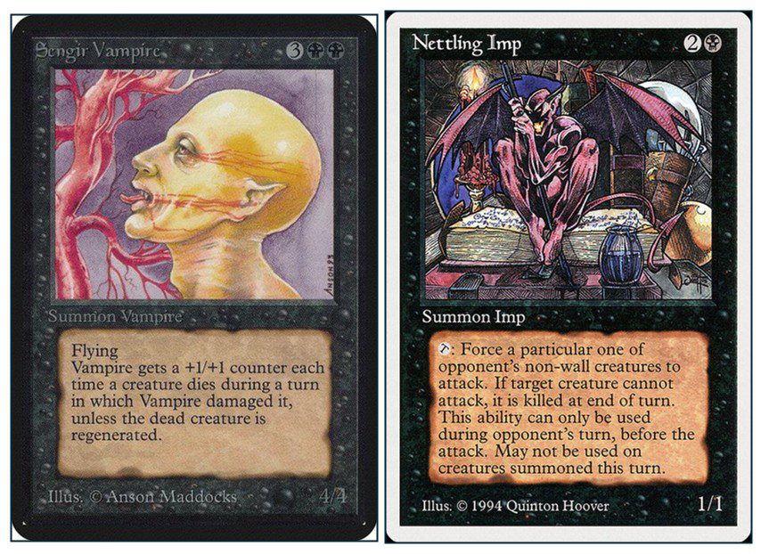 “Sengir Vampire gets stronger whenever it ‘eats’ a smaller creature. We can use Nettling Imp’s ability to force those smaller creatures to attack during your opponent’s turn. Then, we block that creature with the Sengir Vampire. But, here’s the kicker. If you block with multiple Sengir Vampires, they all do damage to that creature, and they all gain the benefits. If we reduce the size of your deck from its current size of 150+ cards down to 60 and add four of each of these to it, that’s 8 out of 60 cards already, and we vastly increase our chances of drawing them when we need them.”