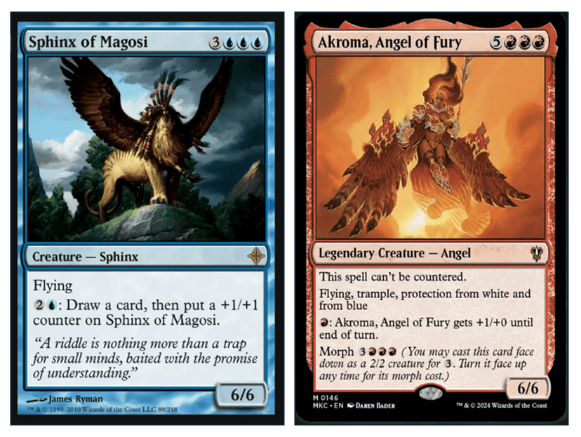 Sphinx of Magosi’s ability to allow me to draw cards while pumping it up (making it stronger by adding counters that increase its power and toughness) makes it extremely appealing. Akroma, Angel of Fury’s another beefy, pumpable creature with a whole host of keywords:
