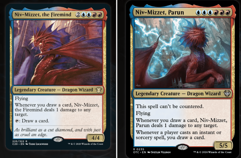 Almost immediately after opening my binder, I came across two cards that seemed like good commander material: Niv-Mizzet, Parun and Niv-Mizzet, The Firemind. Both of these seem like sound candidates, but Niv-Mizzet, Parun seems a bit better since it can’t be countered as it’s being brought into play. And, since its ability allowing me to draw cards can be triggered by any player, it has the potential to be triggered far more often than Niz-Mizzet, The Firemind.