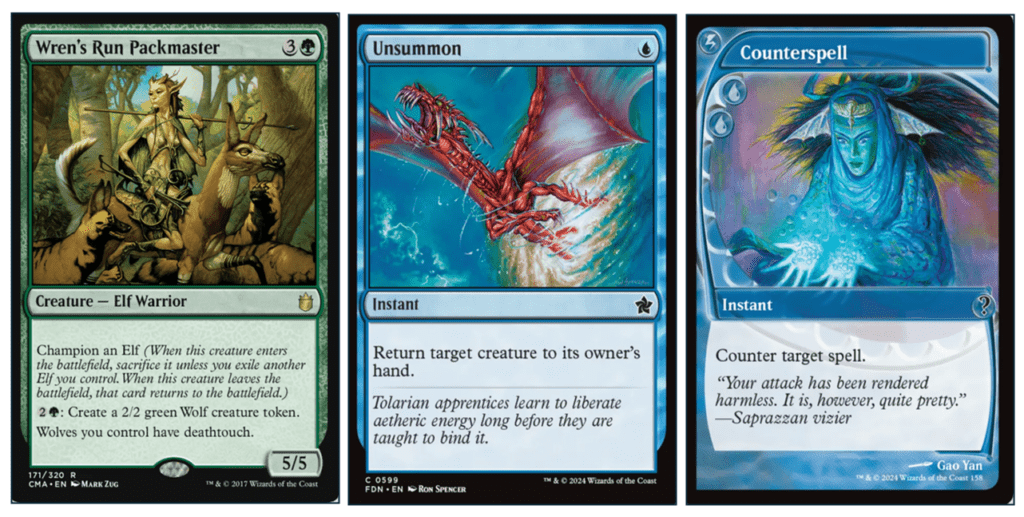 When you attempt to cast a spell from your hand, or use a card’s effect, that attempt goes into an imaginary limbo space called ‘the stack’. Imagine the stack as a physical stack of cards, and each card has your intention written upon it. If that intention is allowed to resolve without any interruption, then your intention comes to fruition. However, if an opponent wishes to do something to interrupt your intention, then (after paying any costs for doing so) their intention is placed onto the stack on top of yours. This intention may be completely unrelated to yours, or it may be something specifically added to mess with your intention. Once players have stopped adding things to the stack, the stack resolves, and it resolves from the top down (last in, first out). Depending on the results, the original intention will either succeed or fail. To better demonstrate this, let’s consider an example using these three cards: Wren’s Run Packmaster, Unsummon, and Counterspell. I am playing a blue/green deck and my opponent, Bob, is playing blue.
