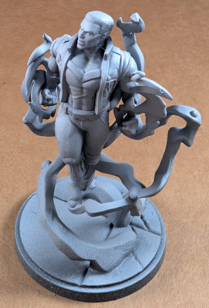 Blue Marvel sits on a 35mm small base, hovering in mid-air with energy swirling around him. It’s a simple but effective pose. The big energy swirl on the base attaches to the back of his legs, while the smaller energy swirl is standalone. I’m sure kitbashers will find something cool to do with this. He’s a little reminiscent of another MCP model, Storm, but thankfully it seems AMG has learned from their previous efforts because he’s nowhere near as spindly and fragile. The energy radiating from his fists gave me pause because it looked quite hard to attach, but they both slid right into recesses in his arms and stayed in place easily.