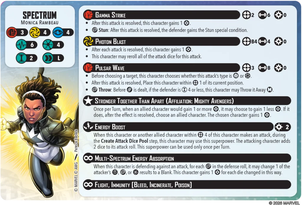 Power gaining leaderships have always been impactful in Marvel: Crisis Protocol. Black Bolt’s Inhumans were all over the place in 2024 mostly because their powerful leadership let them pull off crazy round one shenanigans and maintain a strong power economy. Classic Steve Rogers-led Avengers similarly open up some insanely strong turn one options by discounting your superpowers by one. Spectrum’s leadership could open up similar options by being able to pass power at unlimited range to anyone on her team any time you would gain power (once per turn). With all of her zero cost attacks gaining a power no matter what, this opens up many options for Spectrum to forgo gaining a power to get a teammate’s ability online. She can even start her own power train turn one. I’m excited to see the community get their hands on this new affiliation and try new things.
