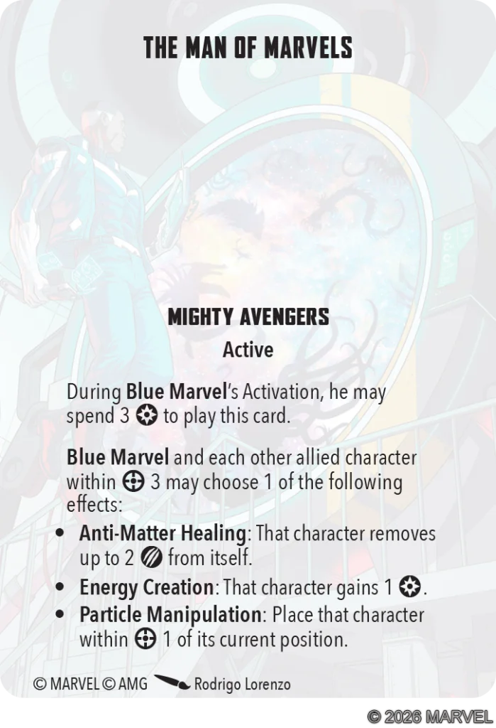 Blue Marvel comes equipped with his personal Team Tactics card, The Man of Marvels. Using this while on a Mighty Avengers team, he can pay three power to grant one effect to himself and each of his allies. They can either heal two damage, gain a power, or place within one of their current position. It’s very similar to Steve Rogers’ card, Battle Plan, with slightly different effects. Battle Plan is a serviceable card that usually doesn’t make the list over other quality Avengers cards, so it’s hard to say if The Man of Marvels will fare much better. With Mighty Avengers being a new affiliation, they will be lacking in card options, so this may make your list by virtue of being an affiliated card.