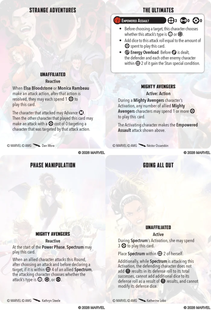 Finally, Spectrum brings with her a ton of Team Tactics cards, as is fitting for a leader of a new affiliation. Her personal card, Going All Out, can be brought in any affiliation. This card seems quite strong, allowing her to pay three power to place herself within range 2, and making it so anyone she attacks this turn doesn’t count critical hits, can’t add dice from critical hits, and cannot modify their dice. As the resident Web Warriors hater, I’m already ecstatic at the idea of hunting down Miles Morales or Peter Parker with this card in tow, shutting off all their obnoxious rerolls. She also gets a team up card with Elsa Bloodstone, Strange Adventures. It’s a bit of an oddball card. Essentially, after one of them attacks, they can both spend one to play it. Whoever attacked gets to move, and whoever didn’t attack gets to attack the enemy that was just attacked. It’s cute, but I’m not sure how often you’ll see Elsa Bloodstone and Spectrum on the table together for it to be relevant.