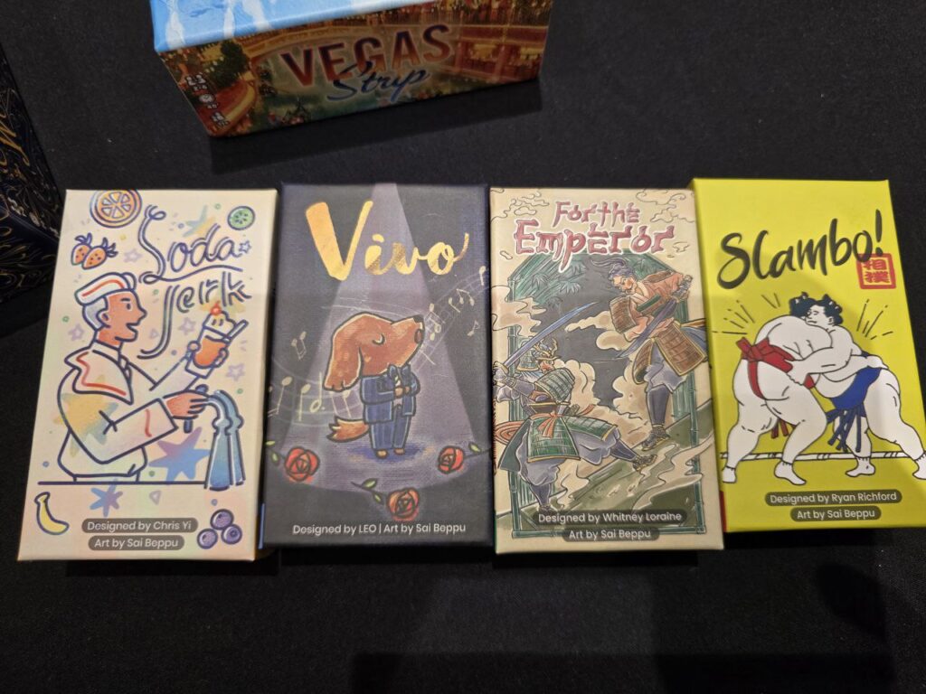 We followed that with Slambo, one of Allplay’s new micro-sized games. It’s a fast card game inspired by sumo wrestling, with players trying to avoid going above ten or below zero. Some cards add special effects, like matching or reversing the turn order. If a player breaks the limit, they take a shame card called “Haji.” The first person to collect three loses, and everyone else wins. It’s silly, quick, and incredibly fun.