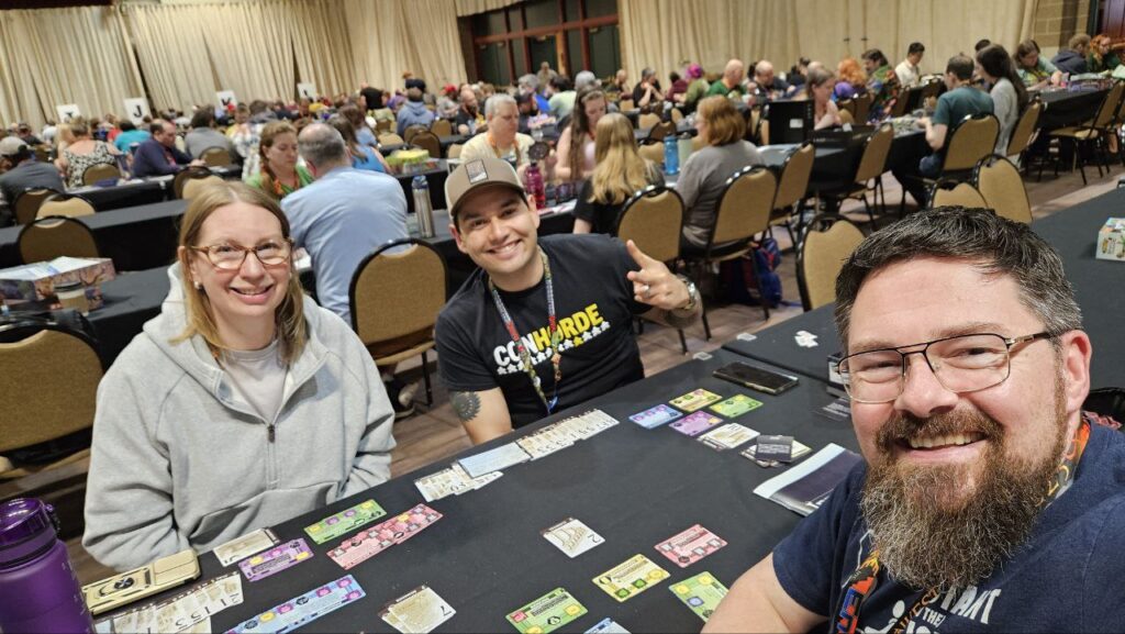 I attended this year while working with Conhorde, representing Board & Dice, and demoing Windmill Valley and Reef Project. There wasn’t a formal booth, but plenty of tables were available to run demos of recent releases. The response from players was enthusiastic, and I enjoyed introducing these games to both newcomers and experienced players. One of the best parts was seeing players return later in the con to teach the same games to others—proof of a great teach and an even greater game.