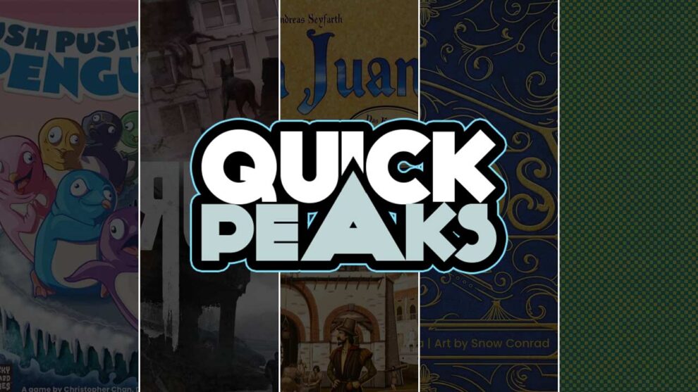 The conceit behind Push Push Penguin (2025, Wacky Wizard Games) is a cute one—penguins are pushing each other down a slippery slope into the ocean, with fun illustrations by Christopher Ryan Chan that look like a cross between the penguins from ICECOOL and a slightly more sinister twist on the animal-themed images I’m used to in many other games. That sinister bit is because Push Push Penguin has an interesting win condition: whoever gets to the ocean and gets “surprised” by an orca token first is the first loser…and the next player in line behind that player wins the game.