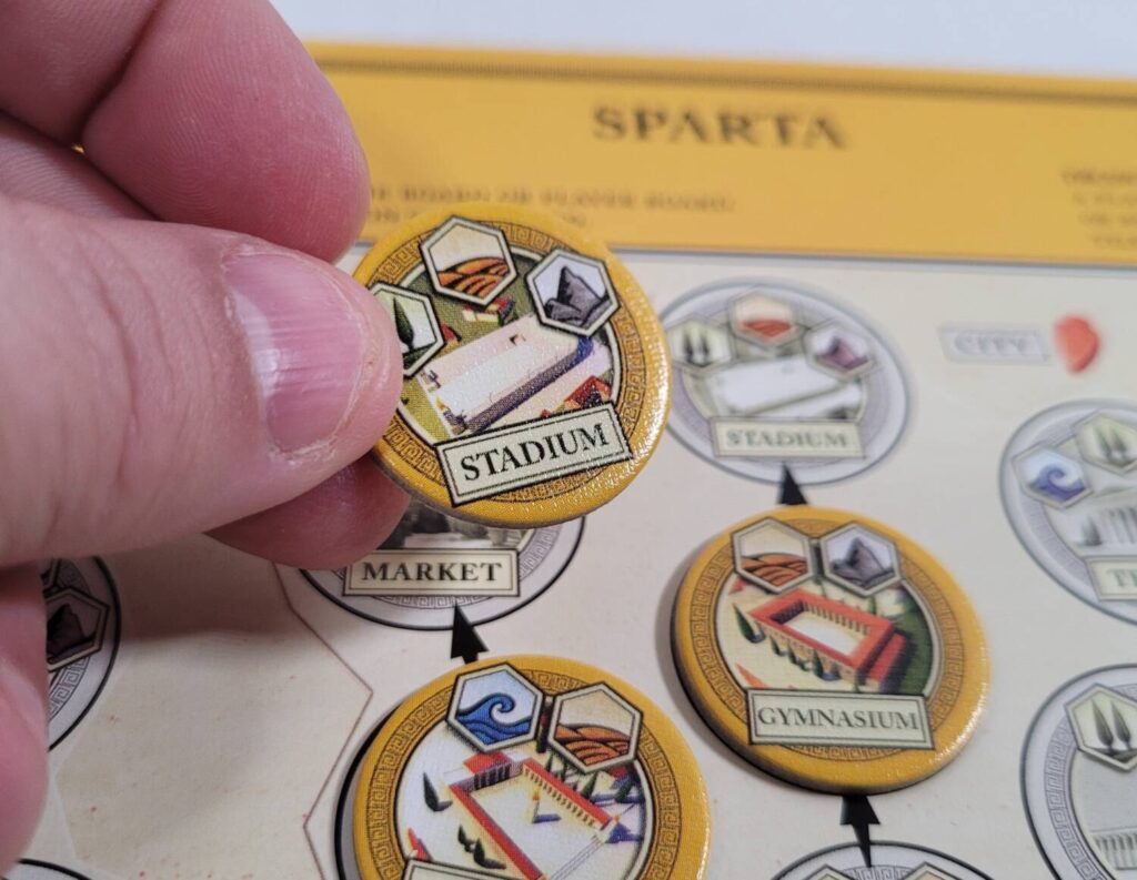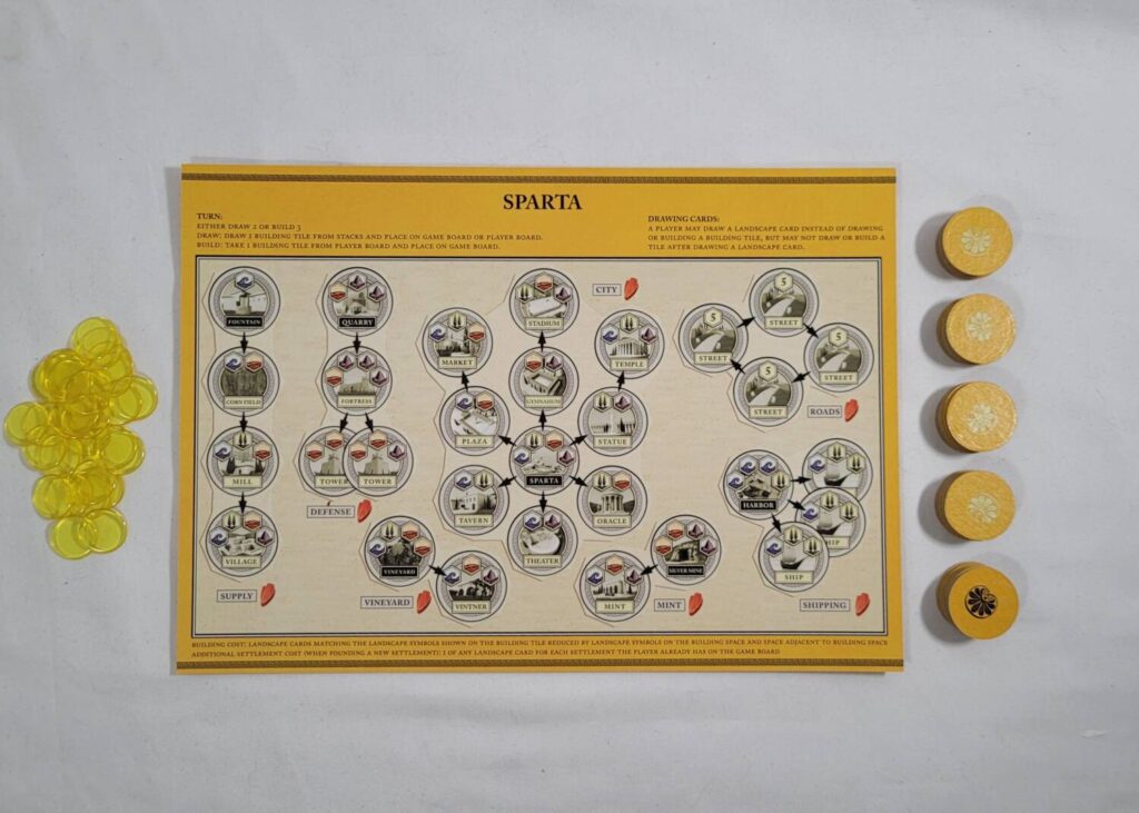 Looking at the game, you can practically see the dust. With its classic maroons, beiges, and olive greens, Attika is not going to be winning any beauty contests. The component quality is designed for functionality: thin player boards, thin cardstock, and a simple bi-folded rules sheet. Produced at a time where production value wasn’t as important as the thing being produced, the game shows its age.