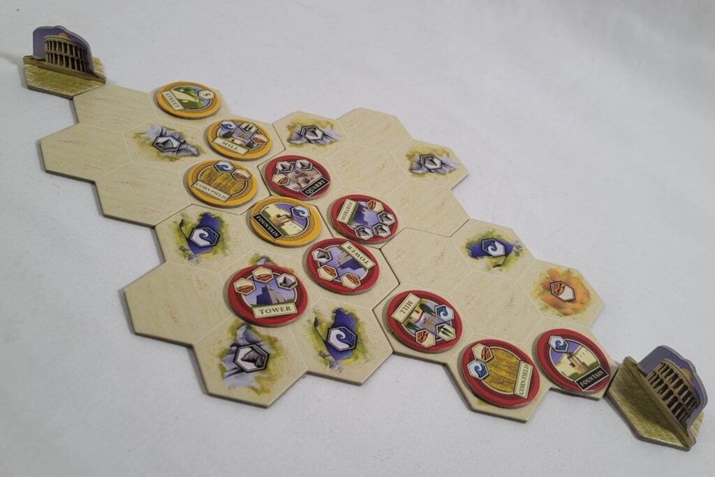 Prior to playing my physical version, I wasn’t aware of just how much bookkeeping the app handles—the stacking of the tiles during setup, the marking of the tile locations on your mat as tiles are constructed and added to the playing area, the colored borders around tiles you’ve already built so you can quickly determine which tiles belong to whom, the enforcement of the rule that makes you have to spend an extra resource when building tiles that aren’t connected to your other ones, and the clear indication of which tiles belong to which groups when you draw them—and I gotta say, it’s definitely missed. It’s not that keeping track of these things is particularly difficult. It’s just that it’s hard to remember to do them when you haven’t had to do them before.
