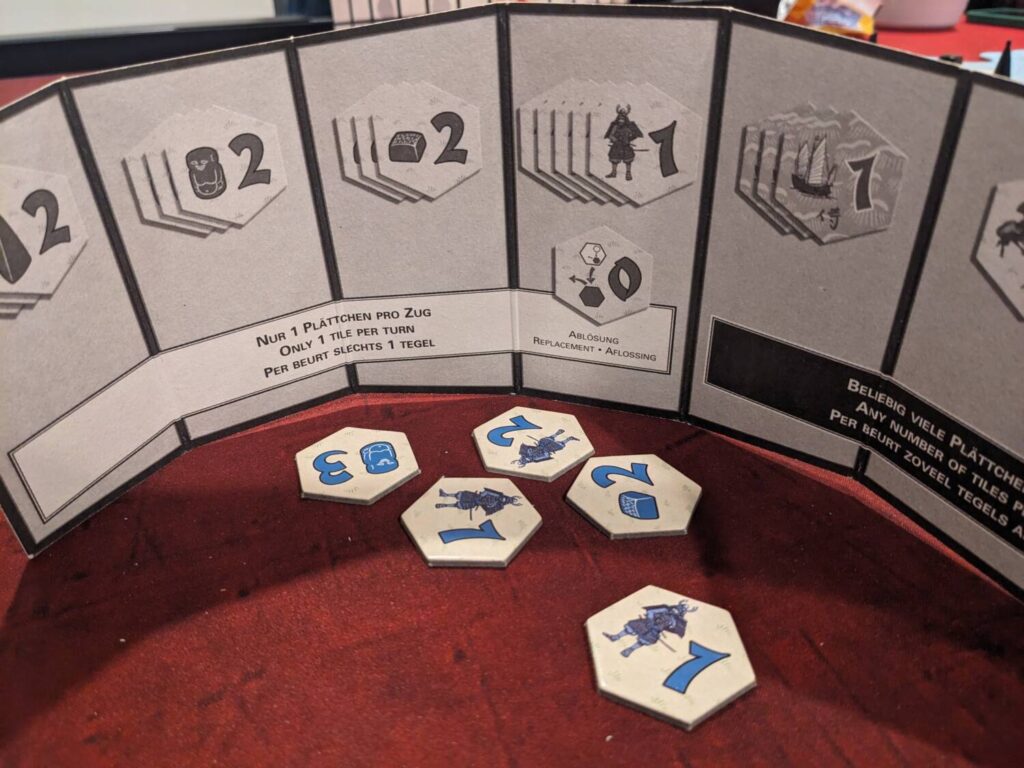 The rules are simple. The board is a series of interlocking hex tiles that feature islands in and around a territory that represents medieval Japan. Beautiful miniatures—especially for a game published in 1998—are used to represent samurai (helmets), peasants (rice fields), and priests (Buddha statues), and are placed in various spaces on the islands. Then, players shuffle their sets of matching placement tiles in front of a screen before drawing five of them in hand, secret only to their owner, behind their screen. The youngest player goes first.