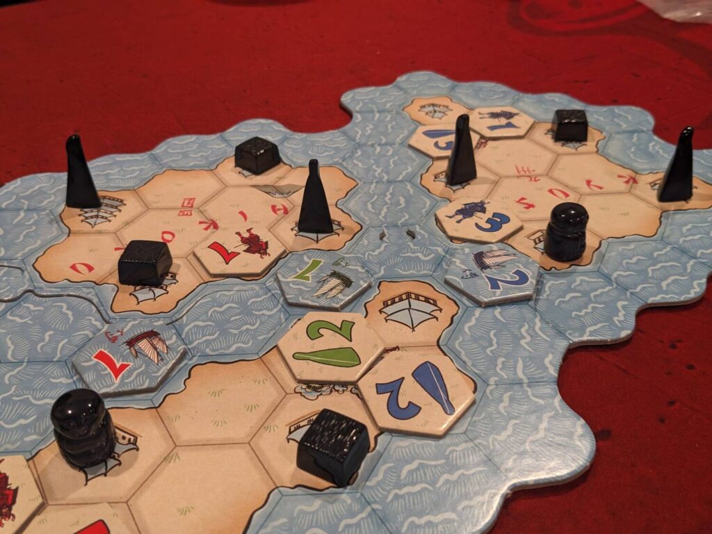 On a turn, players can place one or more tiles on the map, a series of hex-shaped spaces featuring the miniatures that were placed during setup. When a miniature is completely surrounded by tiles on land spaces, a miniature is captured by the person who had the largest majority in strength (between tiles that match the unit type as well as samurai strength, which is used to score everything). In a sneaky twist, some of the tiles represent boats that can be placed adjacent to a miniature that resides next to water, giving players something else to plan for. A small set of each player’s tiles has a symbol that allows them to place an additional tile on their turn.