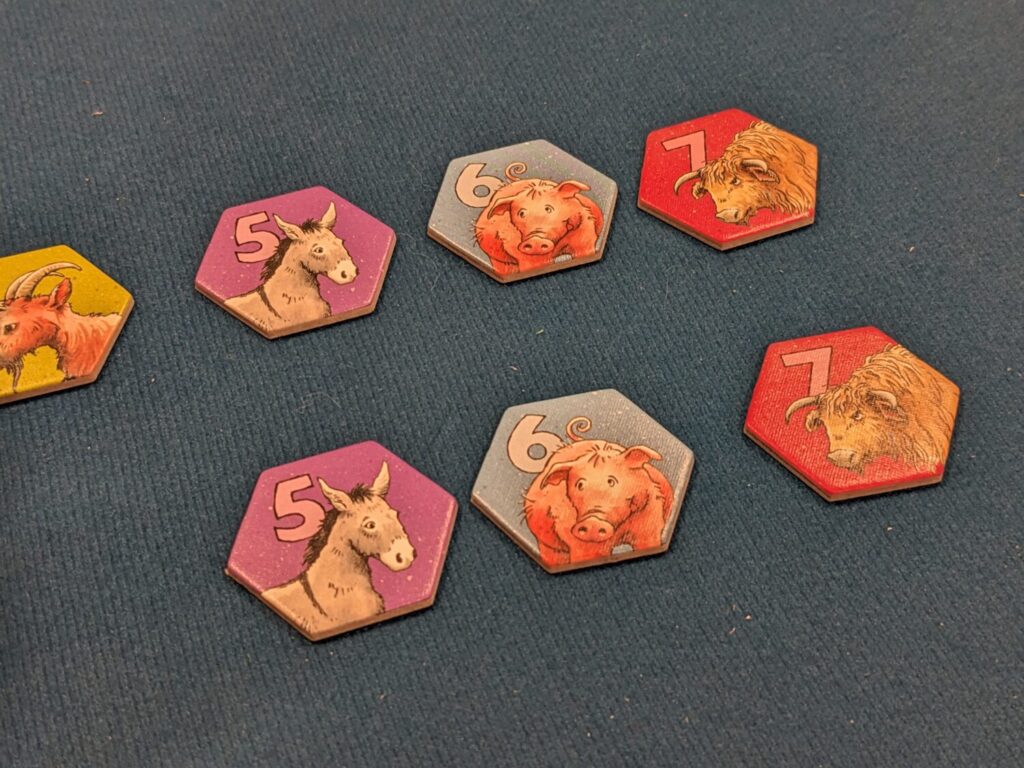 End-game scoring is quick: players add up the values of the tokens scored throughout the game, ranging from 2-7 points each (each farm animal has a value, ranging from lowly chickens up through the 7-point cows). If there’s a tie, the player with the most pig tokens wins…obviously.