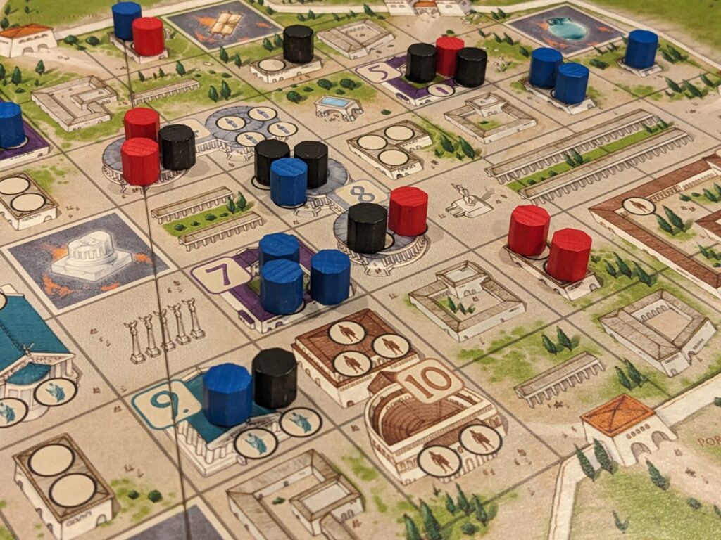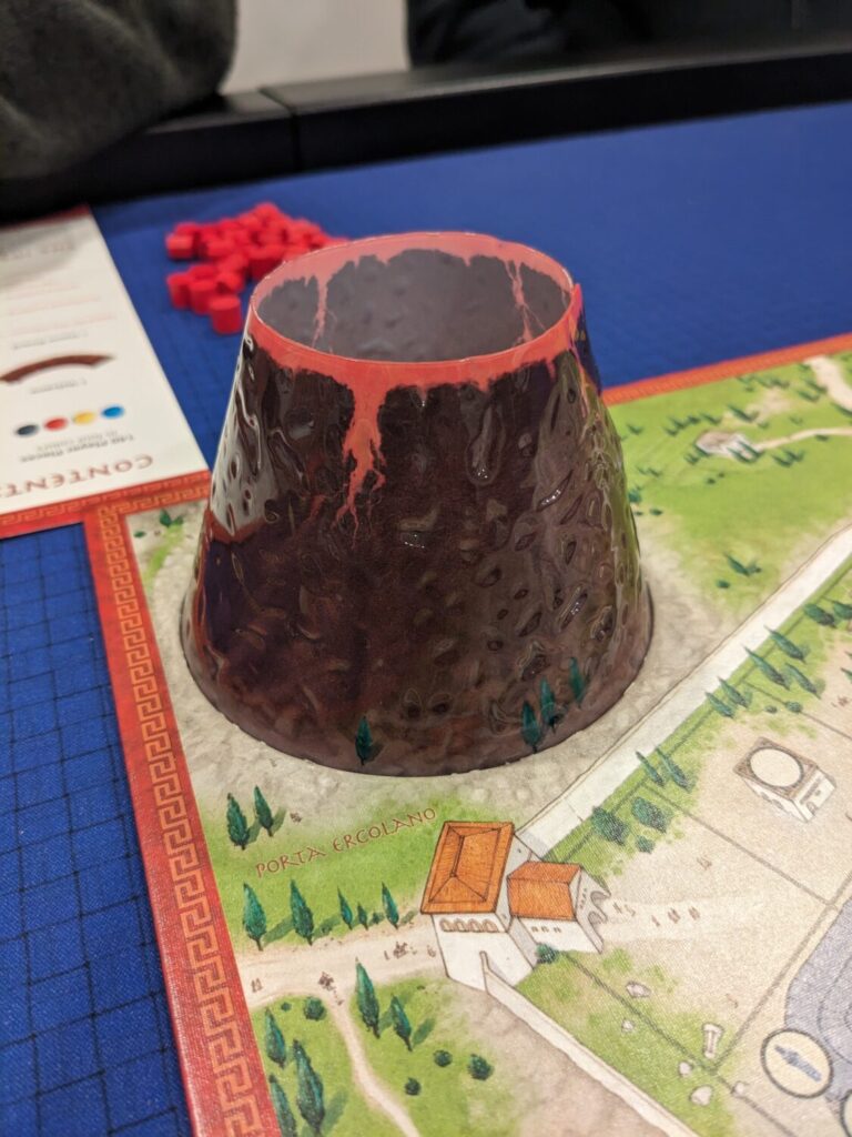 I’m pretty sure I played The Downfall of Pompeii when I first got into “the hobby” many years ago, mainly because I can’t remember another game where it was important to try and hose other players by placing lava tiles on opponent pieces before chucking cubes into the volcano.