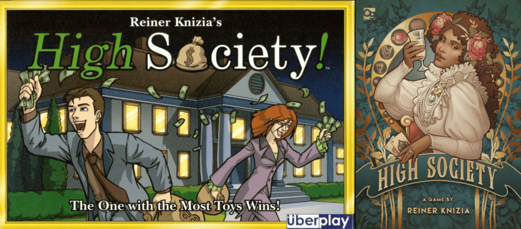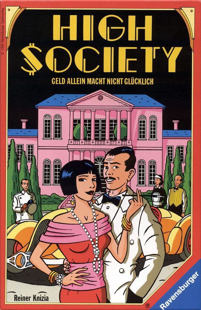 High Society is a near perfect alignment of mechanics and theme, a sharply satirical skewering of class, status and excess. Aside from a few curious animal re-themes, High Society is about rich people spending gross amounts of money for status, whilst trying to remain rich. Early editions had players bidding on race horses, sports cars, luxury yachts, private jets, statues, jewelry and more. The Überplay English edition of 2003 in particular emphasises the tackiness of the super-rich, the hollow boasts of status symbols and the ostentatious displays of the nouveau riche.