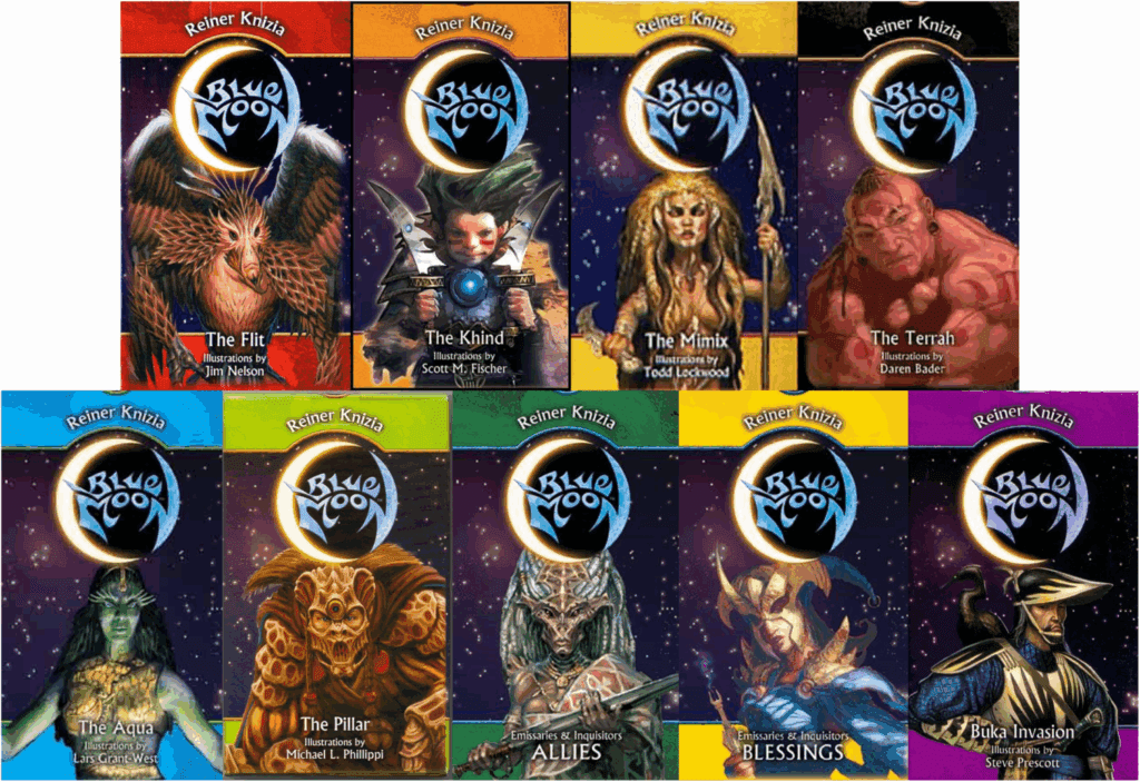 Despite his reluctance to design expansions, several games have seen multiple additions. The most expanded upon game in his entire catalogue is Blue Moon. A two-player duelling card game, 2004’s Blue Moon is Knizia’s answer to Collectable Card Games (CCG) such as Disney Lorcana and Magic: The Gathering (which he mistakenly advised designer Richard Garfield wouldn’t work when first shown a prototype). Featuring a starter set, deck-building and fixed content card expansions, what Knizia actually created was the first ever Living Card Game, a model that Fantasy Flight Games would hone with A Game of Thrones: The Card Game, The Lord of the Rings: The Card Game, Android: Netrunner, Arkham Horror: The Card Game and Marvel Champions among others.