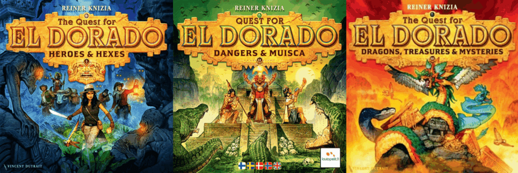 The success (and a nomination for the Spiel des Jahres Award) meant that the first expansion followed in 2018, along with a promo pack. Heroes & Hexes is the first of three large expansions for the game, with Dangers & Musica released in 2022 and Dragons, Treasures & Mysteries in 2023, both released alongside various promos. Sadly, due to licensing issues, there are now two main editions of The Quest for El Dorado and its expansions, with the first version with art by Frank Vohwinkel published by Ravensburger and the second version released in 2019 with art by Vincent Dutrait. It’s confusing and frustrating, the editions and expansions are not cross-compatible and expansions two and three were only ever released with the second edition. If you want to get into the weeds of it, you can read thoughts on the different editions by Knizia himself here and Dutrait here.
