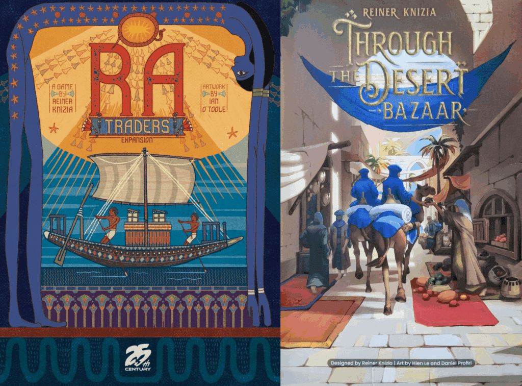 Perhaps most interestingly are the expansions for older games where the original game hasn’t changed (aside from updated art and production). Last year saw the release of Bazaar, the first expansion for 1998’s tile-laying classic Through the Desert, designed specifically for the 2024 Allplay edition of the original. Similarly, in 2023 25th Century Games released a new edition of 1999’s Ra, and this year they released a new expansion for the older statesman of auction games in the form of Traders. Both aim to stimulate renewed interest in the games from those already familiar with them, whilst enticing new players to discover their charms.