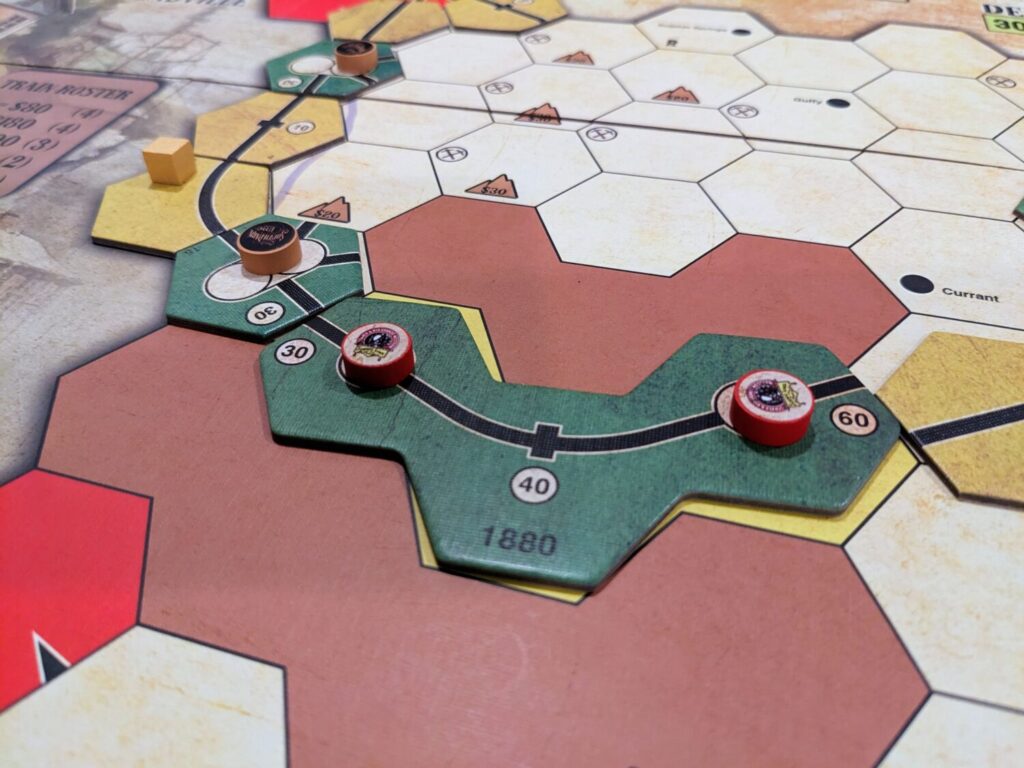 Six of the game’s 11 companies start in the northeast portion of the map, and while I didn’t try this, I would be curious to see how the game would play if the three random corporations were all in that northeast section, joining Rio Grande to create a bit of a mess in that section of the board. That would be folly, and while it may or may not play well, it would absolutely create real drama around spacing and track building. As it was, though, there was usually a good spread between having one or two companies in the center of the map, Rio Grande along the northern edge, Santa Fe in the east, and one of the western companies in each game. This is great for a newer group to ensure players have the space, but I wonder if 18RoyalGorge would be more interesting with less companies.