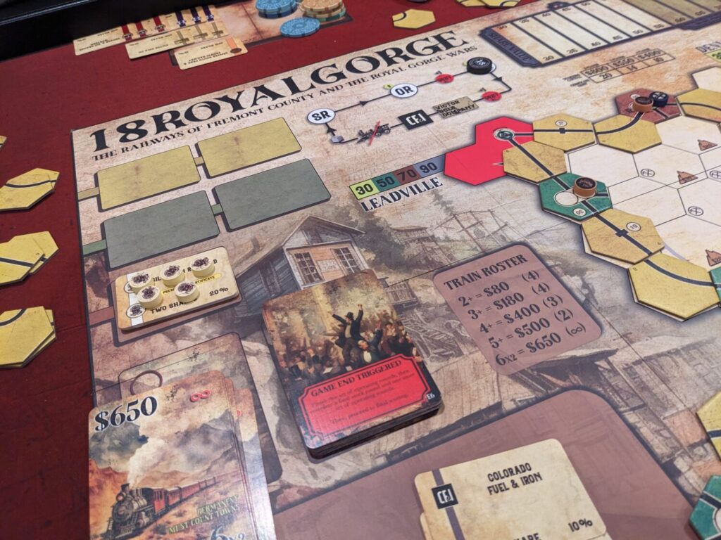 In a four-player game, that automatically means that only half of the players will be able to run a corporation in the first set of operating rounds. I’m surprised to report that 18RoyalGorge is still interesting for investors in that first OR set mainly because of the existence of Colorado Fuel & Iron, the company that other train corporations have to pay to build track throughout the game. In that four-player game, one player played the investor strategy all the way until the end of the game…and won, which I have never seen happen in any other 18xx game before.