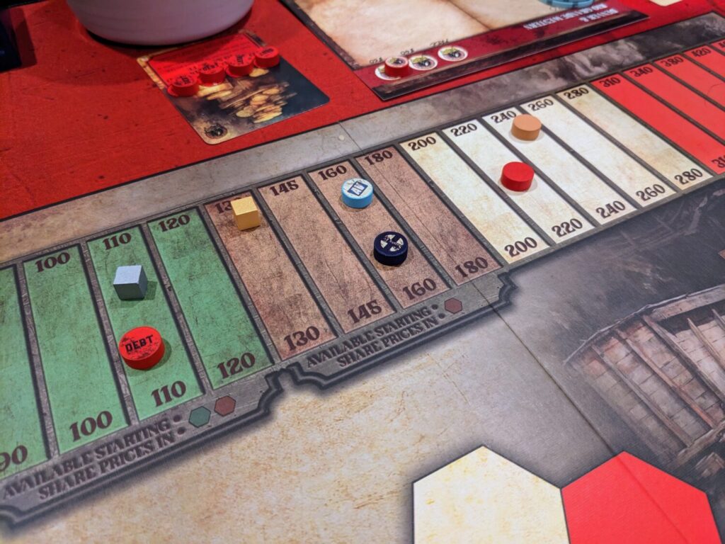 It’s really hard to sink an opponent’s company here thanks to rules that prohibit the loss of market value when non-presidents dump shares. Trains are a part of what is ostensibly an event deck. Gold can be shipped by companies connected to certain map tiles, and some of the game’s private companies operate all the way until the end of the game, not just when the game reaches the brown phase.