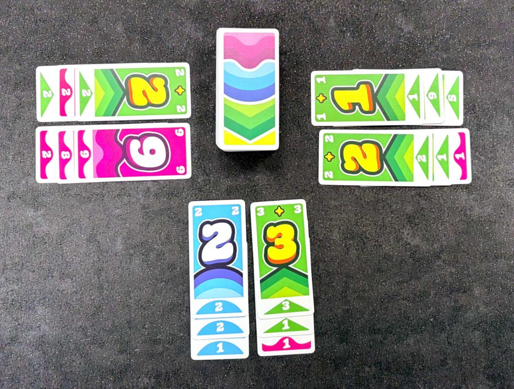 In 2 Win players start with a hand of cards, which run from 1 to 9 in three different colors (pink, blue, and green), with cards featuring 0, 1, or 2 stars. Simultaneously, each player takes two cards and flips them face up in front of them. The card on the left is the “tens” while the card on the right is the “ones”. Thus, if you lay down a 1 and a 2, you have twelve. From the second round onwards, you’re stacking the next two cards atop the previous set, such that you can always see the previous number. The only rule is that the new 2-digit number you place must be higher than the last.