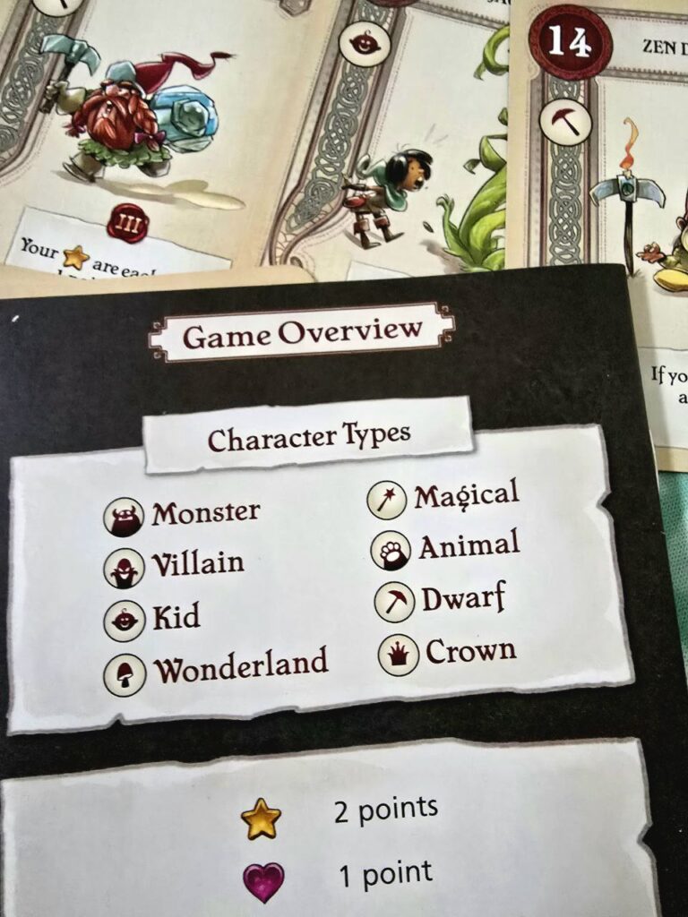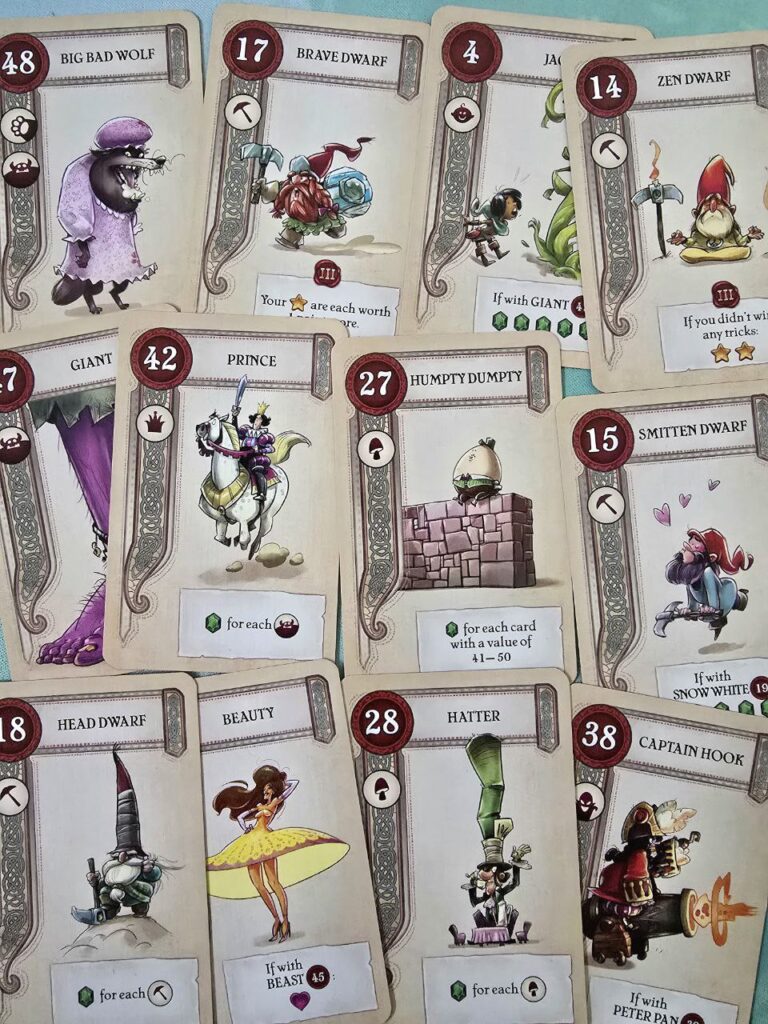 As the title suggests, the game is played over three chapters, with each chapter corresponding to a “mini-game” within the game. The first chapter is a draft where players select cards they’ll use for the rest of the game. Cards are uniquely numbered one through fifty and feature effects that can trigger in the second and/or third chapter. Cards also feature tags that can be used for scoring, varying from monster to villain to wonderland and more. Drafting cards that synergize is the main focus, and cards that originate from the same stories often work well together (e.g., Snow White and Dwarves).