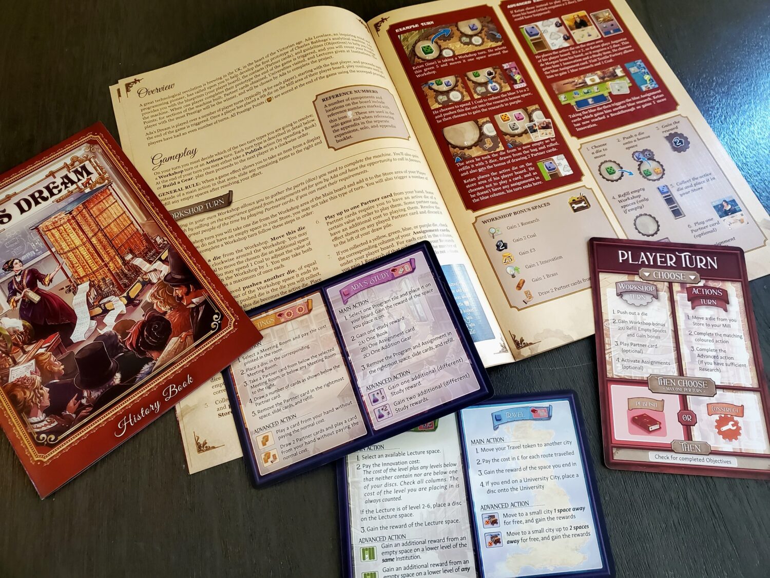 Because this release is hot off the presses as of this review, it is not supported by a wealth of online video content for learning the finished system. Thank heavens, then, for the editorial team at Alley Cat. The real dream of Ada’s Dream is the rulebook. This thing is wonderful—thorough and wonderful. I read it several times prior to teaching the game, and we referenced it repeatedly throughout the first play for added clarity. Whether I or one of my companions went hunting, though, we found answers swiftly and without difficulty. We finished the game having made only the smallest of mistakes. The book is well constructed, well organized, and, well, beautiful.
