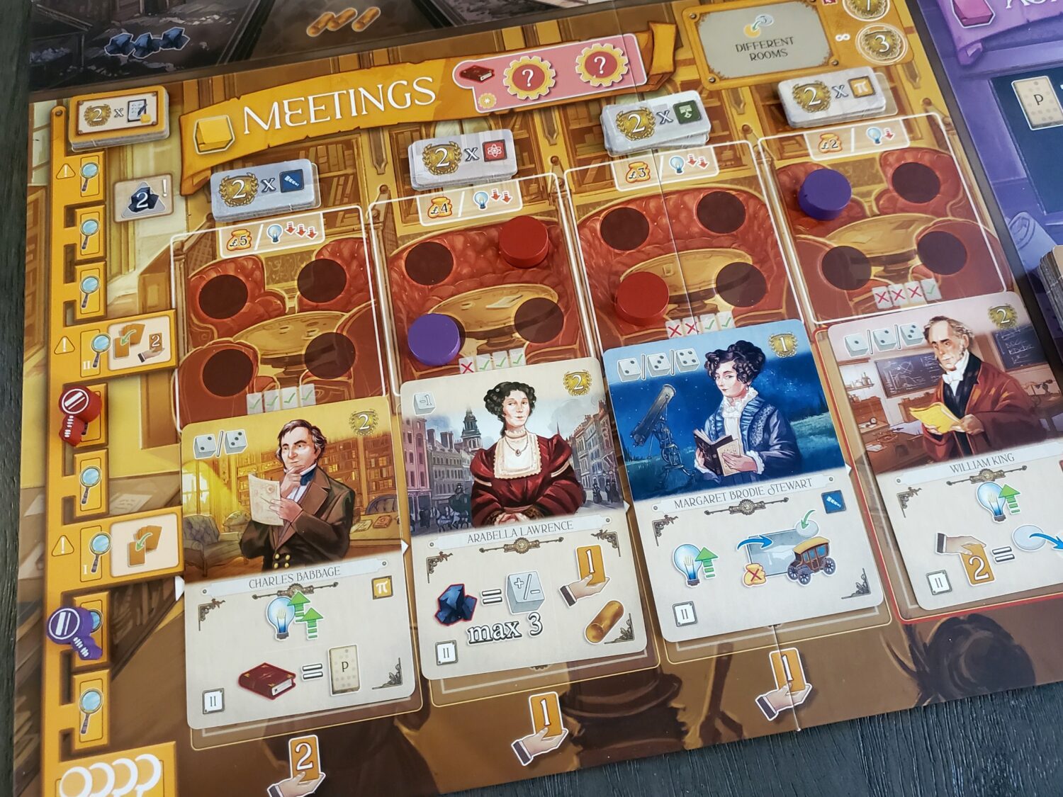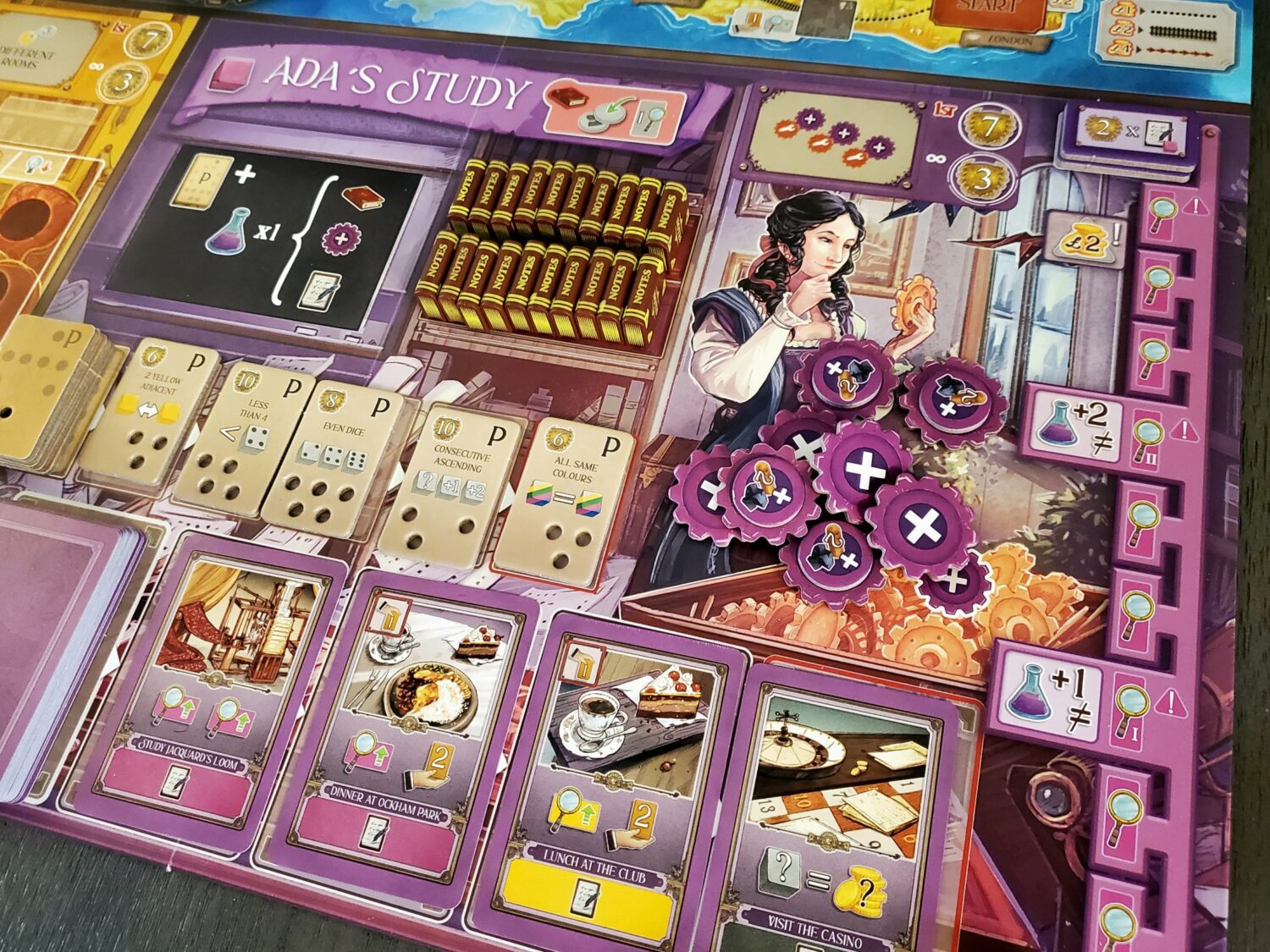 The consensus among our foursome was that Ada’s Study is all but essential as an early priority for players. She provides resources—addition gears, Program tiles, Notebooks, etc.—that directly impact the all-important endgame tally on the player board. There are ways to gather the resources elsewhere, but not with the same speed and regularity.
