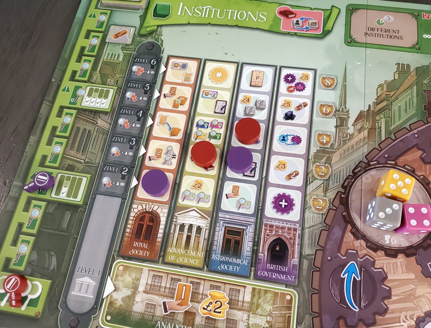 The Institution tracks unleash their bonuses in waves, chasing ever-increasing output along the way by spending Innovation. Moving up the bonus track eventually makes one turn feel like two, and players who dominate here also receive endgame bonuses that incentivize return visits.