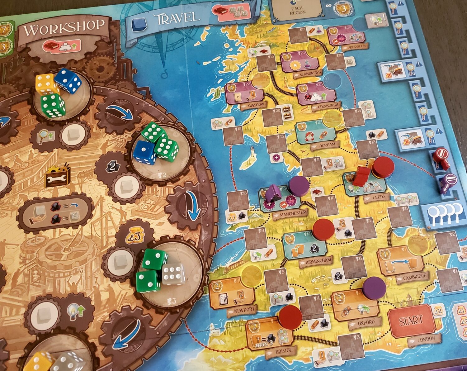 The Travel Map—the blue die—is a map of the British Isles that players navigate freely, limited only by the cash they are willing and able to spend to move by road, rail, and ferry. Small towns grant small rewards. University towns grant larger rewards and—more importantly—allow players to place one of the markers from their board to lay claim to endgame points.