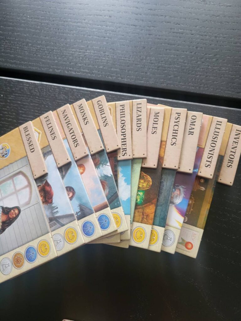 Factions are composed of three things: a terrain type, a faction power, and a faction special building. During setup, players will draft these components one at a time. You are responsible for choosing the best stuff to make your faction work well against all the stuff that other factions are drafting and what you think they’re going to do.